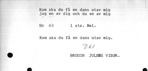 //// ... — . , - - - - //// Kom ska du få en dans utav mig //// jag en av dig och du en av mig //// Nr 63 1 str. Mel. //// Kom ska du få en dans utav mig. //// # BRODIN JULEBS VISOR. ////