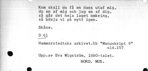 //// Kom skall du få en dans utaf mig, //// du en af mig och jag en af dig, //// så går det hela laget omkring, //// så börja vi på nytt igen. //// * //// Skåne, //// j D 61 //// Hammarstedtska arkivet.Ur "Manuskript 9" //// sid.157 //// ^ Upp.av Eva Wigström, 1880-talet. //// NORD. MUS. ////