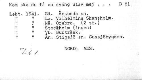 //// i\om sxa au id en bvcmy uuciv ... ^ vj. //// Lekt. 1941. Gä. Årsunda sn. //// " " La. Vilhelmina Skansholm. //// " V Nä. Örebro. (2 st.) //// " " Stoc&holm (ingen) //// " " Vb. Burträsk. //// " " Ån. Stigsjö sn. Gussjöbygden. //// ^ NORD1 MUS. ////