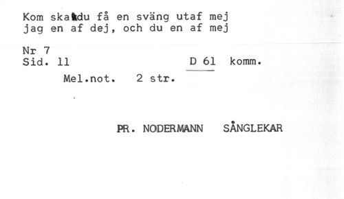 //// Kom skaädu få en sväng utaf mej //// jag en af dej, och du en af mej //// Nr 7 //// Sid. 11 D 61 komm. //// Mel.not. 2 str. //// PR. NODERMANN SÅNGLEKAR ////