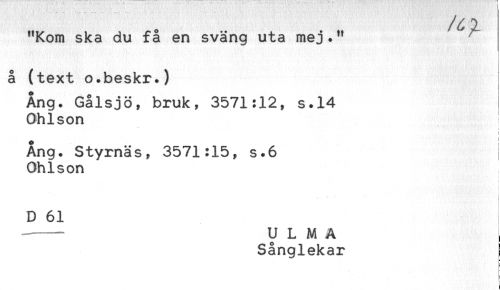 //// "Kom ska du få en sväng uta mej." //// å (text o.beskr.) //// Ang. Gålsjö, bruk, 3571:12, s.14 //// Ohlson //// t //// o i //// Ang. Styrnäs, 3571:15, s.6 //// Ohlson //// D 61 //// ----ULMA //// Sånglekar ////