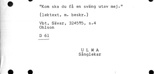 //// ^ "Kom ska du få en sväng utav mej." //// (lektext, m. beskr.) //// Vbt, Sävar, 3245T5, s.4 //// Ohlson //// D 61 //// U L M A //// Sånglekar ////
