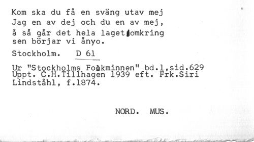 //// Kom ska du få en sväng utav mej //// Jag en av dej och du en av mej, //// å så går det hela lagetfomkring //// sen börjar vi ånyo. //// Stockholm. D 61 //// Ur "Stockholms Folkminnen" bd.l,sid.629 //// Uppt. C.H.Tillhagen 1939 eft. Frk.Siri //// Lindståhl, f.1874. //// NORD. MUS. ////