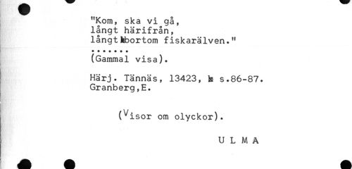 //// "Kom, ska vi gå, //// långt härifrån, //// långtMbortom fiskarälven.'* //// + + * + + + + //// (Gammal visa). //// Härj. Tännäs, 13423, b s.86-87. //// Granberg,E. //// (^isor om olyckor). //// U L M A ////