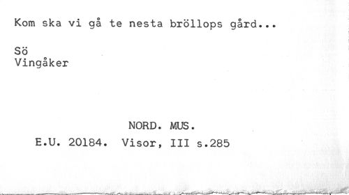 //// Kom ska vi gå te nesta bröllops gård... //// : //// SÖ //// Vingåker //// NORD. MUS. //// E.U. 20184. Visor, III s.285 ////