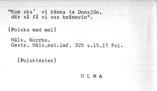 //// "Kom ska' vi ränna te Donsjön, //// där så få vi oss brännvin". //// (Polska med mel) I //// Häls, Norrbo. //// Gestr, Häls,nat.lmf. 325 s.15,17 Fol. //// (Polsktexter) //// U L M A ////