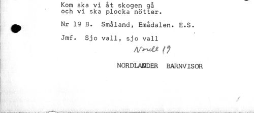 //// och vi ska plocka nötter. //// ^ Nr 19 B. Småland, Emådalen. E.S. //// Jmf. Sjo vall, sjo vall //// NORDLANDER BARNVISOR //// t ////