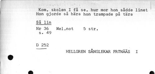 //// - * //// * — \ 1 - - A - //// * * . - //// Kom, skolen I få se, hur mor hon sådde linet //// Hon gjorde så hära hon trampade på tära //// Så lin //// Nr 36 Mel,not 5 str, //// s. 49 //// D 252 //// * //// * ' HELLGREN SÅNGLEKAR FR7NÄÄS I ////