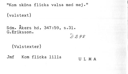 //// "Kom skona tlicka valsa med mej." //// * //// (valstext) //// Sdm. Åkers hd, 347:59, s.31. //// G.Eriksson. //// (Valstexter) //// Jmf Kom flicka lilla U L M A ////