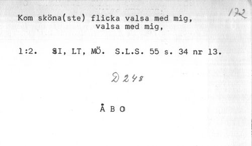//// Kom sköna(ste) flicka valsa med mig, //// valsa med mig, //// . //// - //// 1:2. SI, LT, MÖ. S.L.S. 55 s. 34 nr 13. //// . //// ÅBO ////