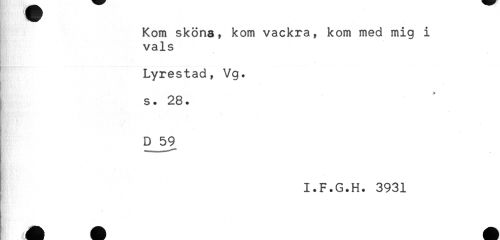 //// - //// Kom sköna, kom vackra, kom med mig i //// vals //// Lyrestad, Vg. //// t //// s. 28. //// D 59 //// I.F.G.H. 3931 ////