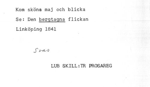 //// Kom sköna maj och blicka i //// w //// Se: Den bergtagna flickan //// Linköping 1841 //// LUB SKILL:TR PROSAREG ////