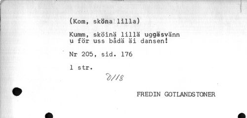 //// (Kom, sköna lilla) //// Kumm, sköinä lilla uggäsvänn //// u för uss båda äi dansen! //// Nr 205, sid. 176 //// 1 str. //// ^ FREDIN GOTLANDSTONER //// * ////