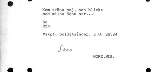 //// Kom sköna maj, och blicka //// med milda Ögon ner... //// Bo //// Bro //// Mskpt. Soldatsånger. E.U. 28384 //// NORD. ms. ////