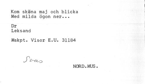 //// Kom sköna maj och blicka //// Med milda ögon ner... //// i //// Dr //// Leksand ! //// r //// t //// Mskpt. Visor E.U. 31184 //// NORD.MUS. ////