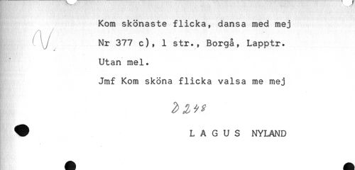 //// Kom skönaste flicka, dansa med mej //// Nr 377 c), 1 str., Borgå, Lapptr. //// K-' / //// Utan mel. //// g'- //// Jmf Kom sköna flicka valsa me mej //// ^ L A G U S NYLAND //// - ////