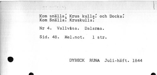 //// Kom snällaJ Krus kullaf och Dockad //// Kom Snälla^ Kruskulla^ //// ^ * ^ -. . - //// Nr 4. Vallvisa. Dalaraa. //// Sid. 48. Mel.not. 1 str. //// # DYBECK RUNA Juli-häft. 1844 //// . ////