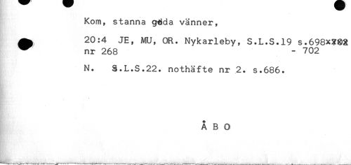 //// Kom, stanna g-dda vänner, //// ^ 20:4 JE, MU, OR. Nykarleby, S.L.S.19 s.698x3?8i //// ^ nr 268 - 702 //// N. S.L.S.22. nothäfte nr 2. s.686. //// * //// ' //// ÅBO ////