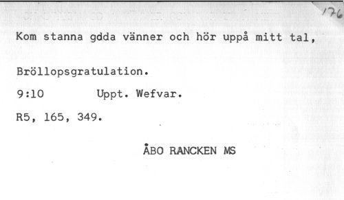 //// ; - - ....... - ' //// Kom stanna gdda vänner och hör uppå mitt tal, //// Bröllopsgratulation. //// 9:10 Uppt. Wefvar. //// R5, 165, 349. //// v ' * * //// ÅBO RÅNCKEN MS ////