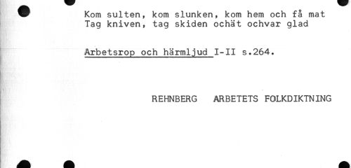 //// * Kom sulten, kom slunken, kom hem och få mat //// Tag kniven, tag skiden ochät ochvar glad //// - //// Arbetsrop och härmljud 1-11 s.264. //// , REHNBERG ARBETETS FOLKDIKTNING ////