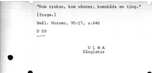 //// "Kom syskon, kom vänner, komskåda en ting." //// (fragm.) //// Smal. Hossmo, 95:17, s.846 //// D 59 //// - //// ULMA //// Sånglekar ////