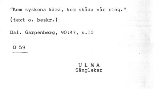 //// "Kom syskona kära, kom skåda vår ring." //// (text o. beskr.) //// Dal. Garpenberg, 90:47, s.15 //// 't i'' ^^-MHHHBBMHz //// D 59 //// * //// ULMA //// Sånglekar ////