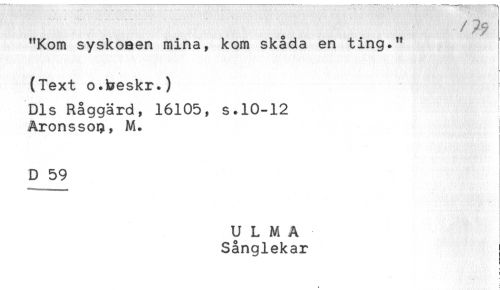 //// "Kom syskoBen mina, kom skada en ting." ! //// (Text o.beskr.) //// Dis Råggärd, 16105, s.10-12 ! //// Aronsson, M. I //// D 59 //// U L M A //// Sånglekar //// i //// ! ////
