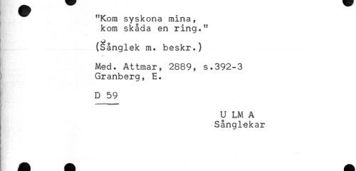 //// "Kom syskona mina, //// kom skåda en ring." //// (Sånglek m. beskr.) //// Med. Attmar, 2889, s.392-3 //// Granberg, E. //// D 59 //// U LM A //// Sånglekar ////