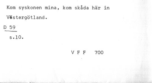 //// Kom syskonen mina, kom skåda här in //// Västergötland. //// D 59 //// s.10. //// V F F 700 //// * //// t ^ .' i ////