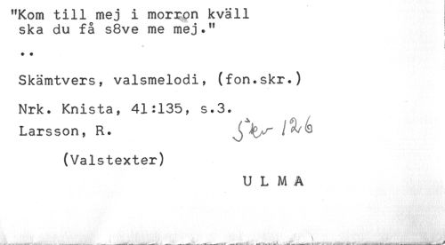 //// "i\,om Lin mej i mojr^oii //// ska du få s8ve me mej.*' //// c //// * * //// Skämtvers, valsmelodi, (fon.skr.) //// Nrk. Knista, 41:135, s.3. //// Larsson, R. ^^ //// (Valstexter) //// U L M A ////