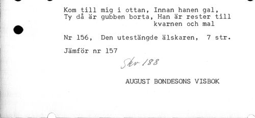 //// Kom till mig i ottan, Innan hanen gal, //// Ty då är gubben borta, Han är rester till //// ^^ kvarnen och mal //// Nr 156, Den utestängde älskaren, 7 str. //// Jämför nr 157 //// j //// AUGUST BONDESONS VISBOK ////