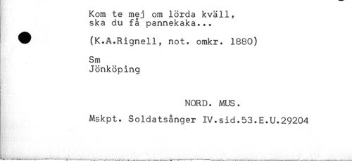 //// Kom te mej om lörda kväll? //// ska du få pannekaka... //// ^ (K.A.Rignell, not. omkr. 1880) //// Sm //// Jönköping //// & //// § //// r //// NORD. MUS. //// Mskpt. Soldatsånger IV.sid.53.E.U.29204 ////