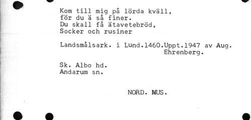 //// Kom till mig på lörda kväll, //// r* * + i ++ o * //// for du a sa fmer. //// Du skall få atavetebröd, //// Socker och rusiner //// Landsmålsark. i Lund.1460.Uppt.1947 av Aug. //// i Ehrenberg. //// Sk. Albo hd. //// Andarum sn. //// NORD. MUS. //// ** ////
