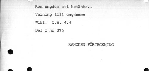 //// Kom ungdom att betänka.. //// Varning till ungdomen //// Wikl. Q.W. 4.4 //// Del I nr 375 //// RANCKEN FÖRTECKNING //// * ////