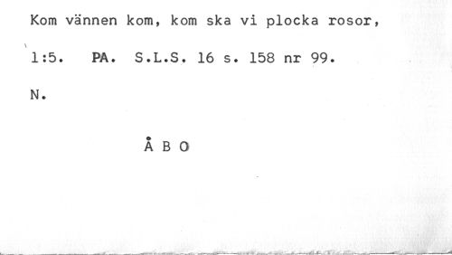 //// Kom vännen kom, kom ska vi plocka rosor, //// \ //// 1:5. PA. S.L.S. 16 s. 158 nr 99. //// N. //// ÅBO //// < ////