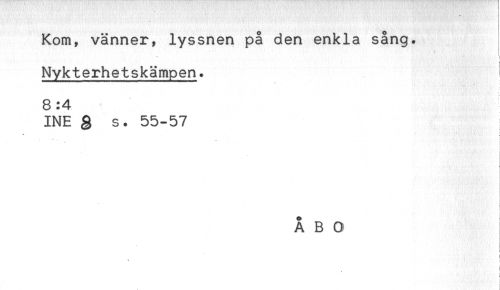 //// Kom, vänner, lyssnen på den enkla sång. //// Nykterhetskämpen. //// 8:4 //// INE g s. 55-57 //// t //// * . . * //// ÅBO //// i //// } //// < //// ! ////