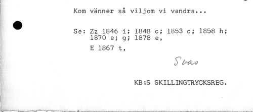 //// Kom vänner så viljom vi vandra... //// ^ Se: Zz 1846 i; 1848 c; 1853 c; 1858 h; //// 1870 e; g; 1878 e, //// E 1867 t, //// i y^^t^? //// KB:S SKILLINGTRYCKSREG. ////