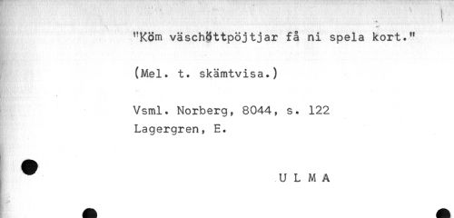//// ^'Köm väsch^ttpöjtjar få ni spela kort." //// (Mel. t. skämtvisa.) //// v.. //// Vsml. Norberg, 8044, s. 122 //// Lagergren, E. //// ; ULMA ////