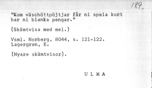 //// "Kom väschöttpöjtjar får ni spela kort //// har ni blanka pengar." //// (Skämtvisa med mel.) //// Vsml. Norberg, 8044, s. 121-122. //// Lagergren, E. //// (Nyare skämtvisor). //// < //// U L M A I //// B //// = ////