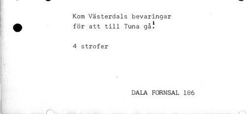 //// I Kom Västerdals bevaringar //// ^ för att till Tuna gå! //// 4 strofer //// \ //// DALA FORNSAL 186 //// ^ .....r^, - _ . _ _ . ////