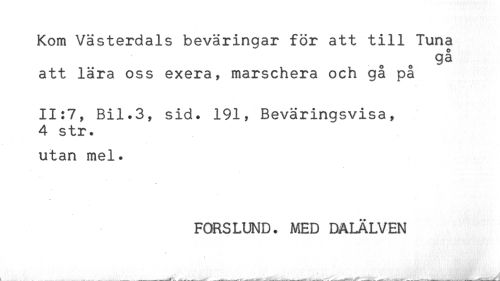 //// Kom Västerdals beväringar för att till Tuna //// o //// . o 93 //// att lära oss exera, marschera och gå på //// 11:7; Bil.3, sid. 191, Beväringsvisa, //// 4 str. //// utan mel. //// FORSLUND. MED DALÄLVEN ////