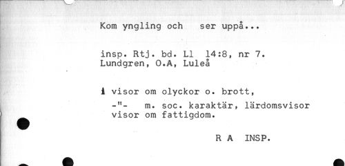 //// Kom yngling och ser uppå... //// * //// ' //// insp. Rtj. bd. L1 14:8, nr 7. //// Lundgren, O.A, Luleå //// <* //// i visor om olyckor o. brott, //// -"- m. soc. karaktär, lärdomsvisor //// ' ^^ visor om fattigdom. //// R A INSP. ////