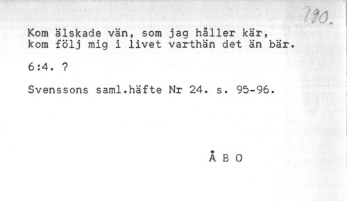//// Kom älskade vän, som jag håller kär, //// kom följ mig i livet varthän det än bär. //// f //// i //// ! //// t //// 6:4. ? //// f //// : //// Svenssons saml.häfte Nr 24. s. 95-96. //// < //// ! ////