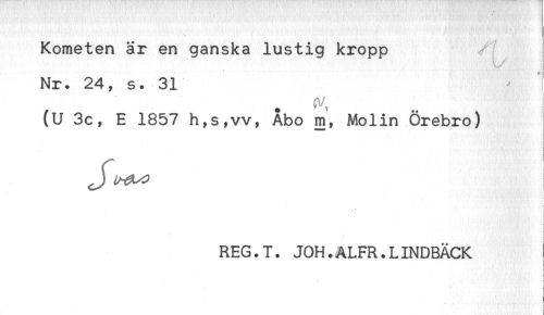 //// Kometen är en ganska lustig kropp y //// Nr. 24, s. 31 //// (U 3c, E 1857 h,s,vv, Abo m, Molin Örebro) //// ! //// REG.T. JOH.ALFR.LINDBÄCK //// i //// i //// . * < ////