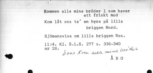 //// r - '...... - - //// Kommen alla mina bröder I som haver //// ett friskt mod //// Kom låt oss ta' en hyra på lilla //// briggen Nord. //// Sjömansvisa om lilla briggen Ros. //// 11:4. Kl. S.L.S. 277 s. 338-340 //// nr 28. ^ . //// ^^ ÅBO //// * * ////