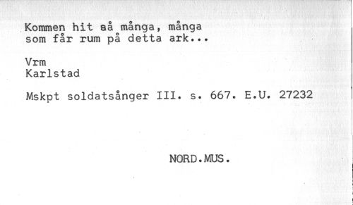 //// Kommen hit aå många, många //// som får rum på detta ark... //// Vrm //// Karlstad //// Mskpt soldatsånger III. s. 667. E.U. 27232 //// t //// NORD. MUS. //// r ////