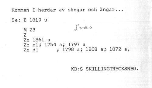 //// Kommen I herdar av skogar och ängar... //// Se: E 1819 u //// M23 //// Z //// Zz 1861 a //// Zz cl; 1754 a; 1797 a //// Zz dl ; 1798 a; 1808 a; 1872 a, //// KB:S SKILLINGTRYCKSREG. ////