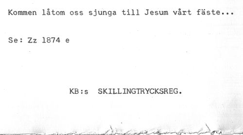 //// Kommen låtom oss sjunga till Jesum vårt fäste... //// Se: Zz 1874 e //// KB:s SKILLINGTRYCKSREG. //// Yv' ,,..- , - - \ //// —-—_____-^ ////