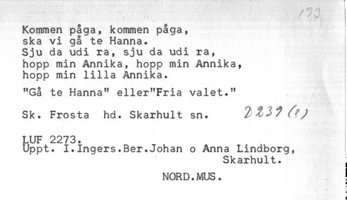 //// Kommen påga, kommen påga, //// ska vi gå te Hanna. ! //// Sju da udi ra, sju da udi ra, //// hopp min Annika, hopp min Annika, //// hopp min lilla Annika. //// "Gå te Hanna" eller"Fria valet." //// Sk. Frosta hd. Skarhult sn. //// LUF 2273. //// Uppt. I.Ingers.Ber.Johan o Anna Lindborg, //// Skarhult. j //// NORD.MUS. ! //// t- //// . ^ ! //// B ////