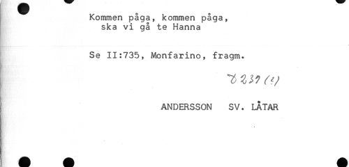 //// Kommen pågå, kommen påga, //// ska vi gå te Hanna //// Se 11:735, Monfarino, fragm. //// ANDERSSON SV. LÅTAR //// & ////